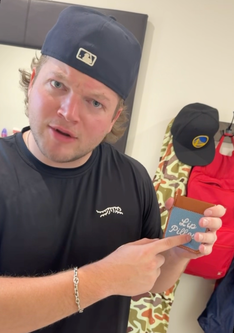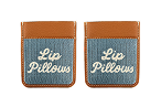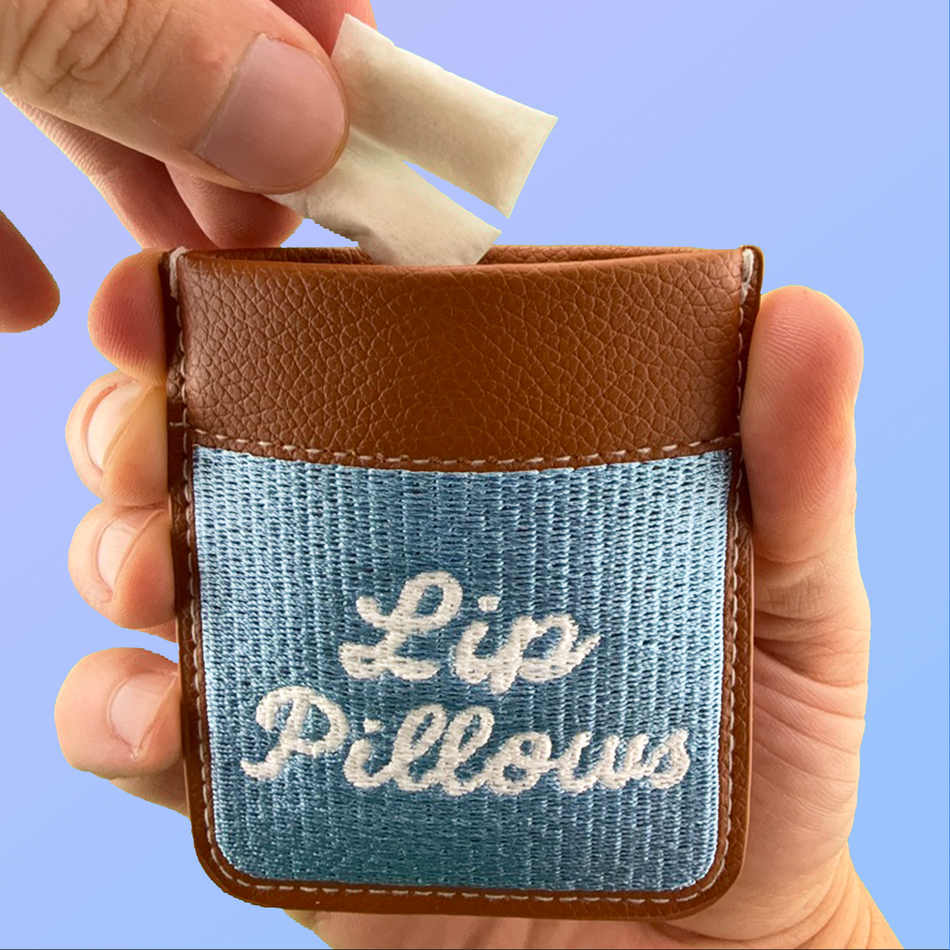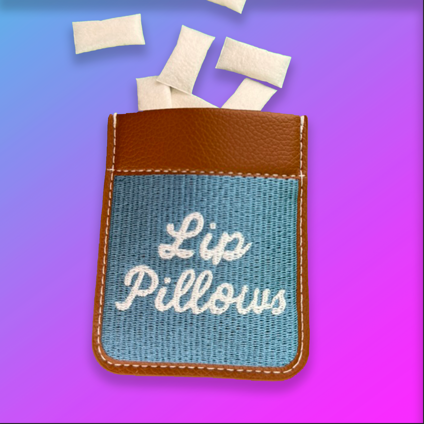 Cheddy and SLYD partnered to create this exclusive, limited-time design. A  pebbled brown leather SLYD accented with a light blue needlepoint that pops with “LIP PILLOWS”.